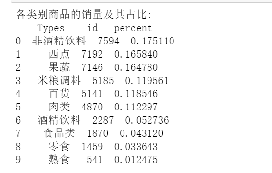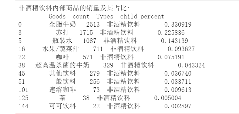 print('非酒精饮料内部商品的销量及其占比:\n',selected)
