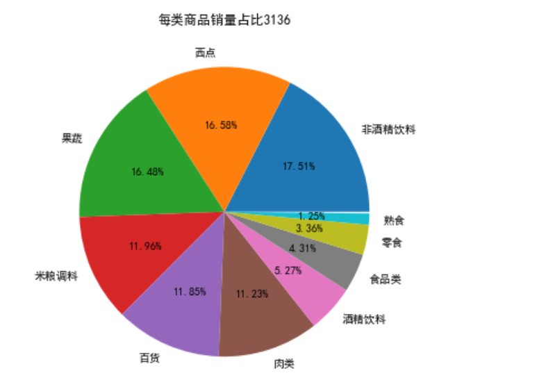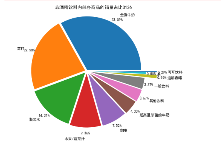 plt.title("非酒精饮料内部各商品的销量占比3136") # 设置标题