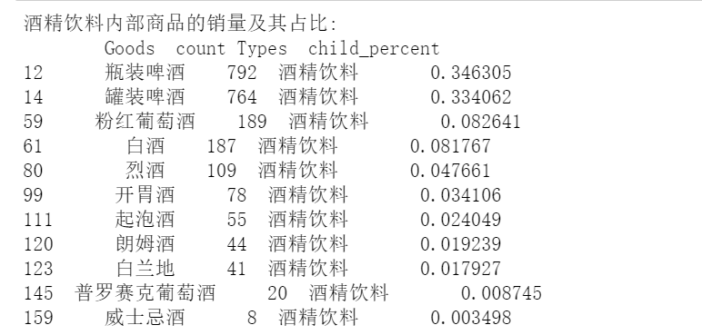 print('酒精饮料内部商品的销量及其占比:\n',selected)