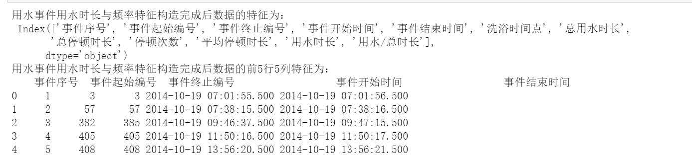 print('用水事件用水时长与频率特征构造完成后数据的前5行5列特征为:\n',