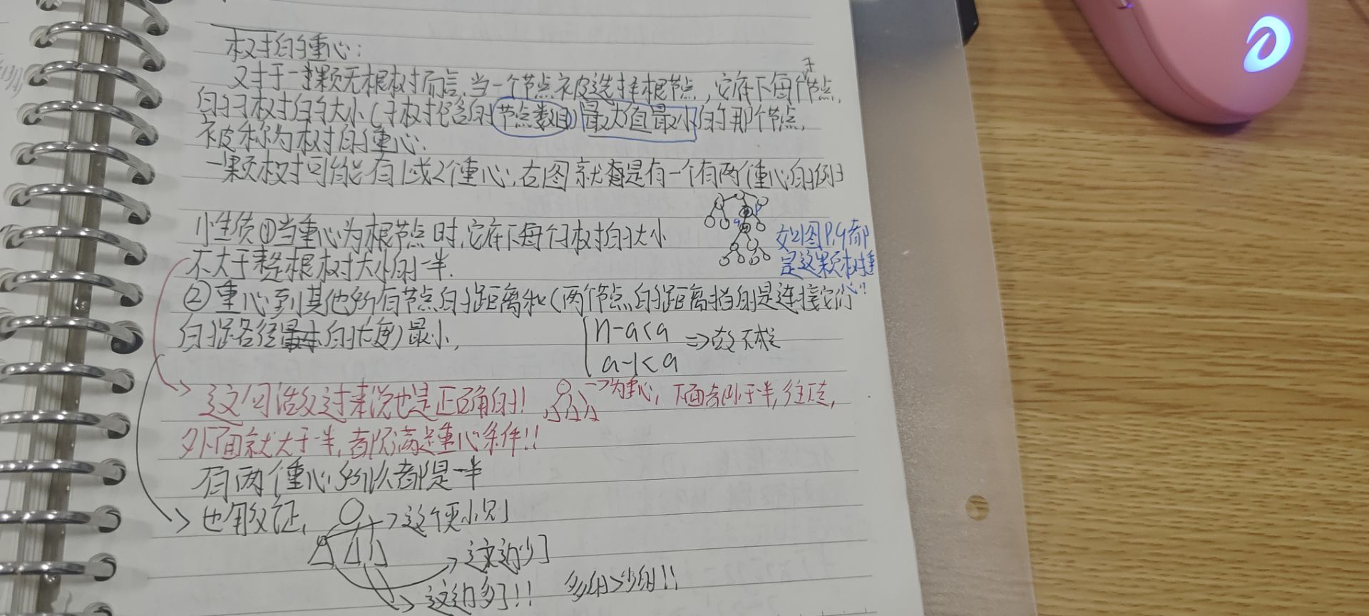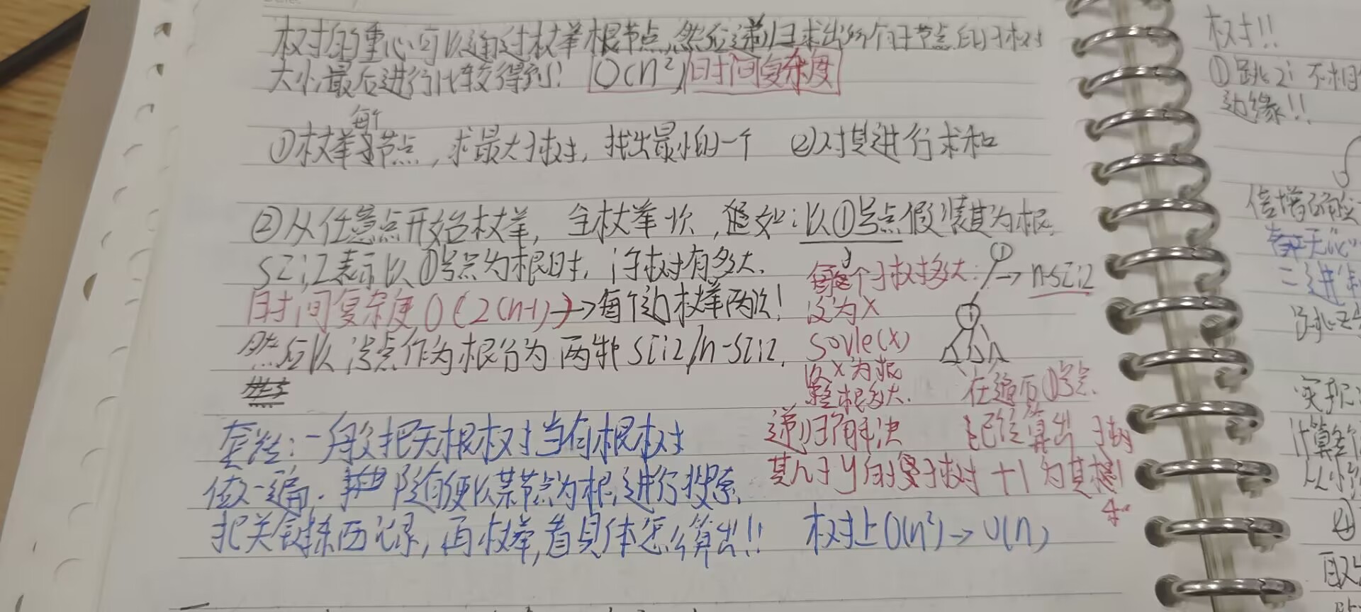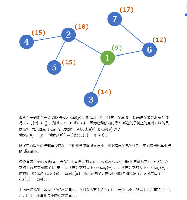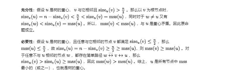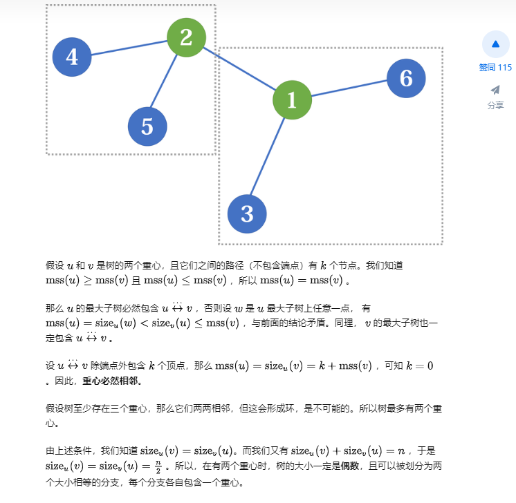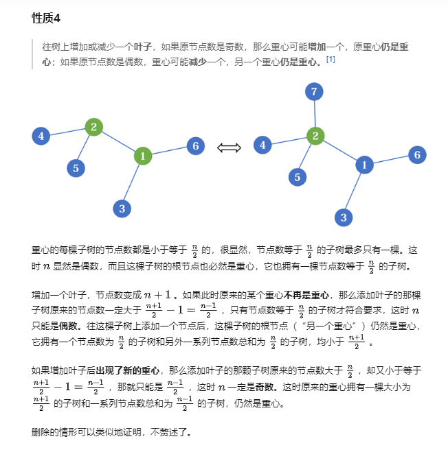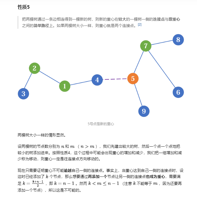 5.树至多有两个重心。如果树有两个重心,那么它们相邻。此时树一定有偶数个节点,且可以被划分为两个大小相等的分支,每个分支各自包含一个重心。