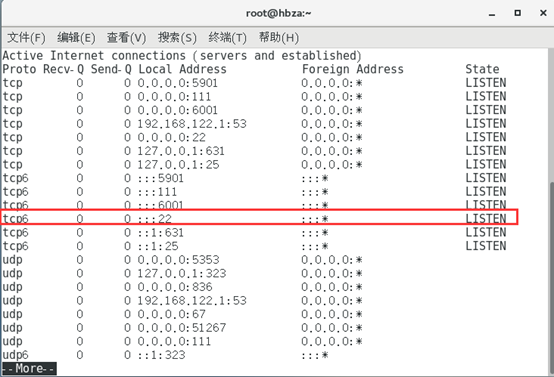 第三步:查看是否有22号端口,命令:netstat -an|more,截图如下
