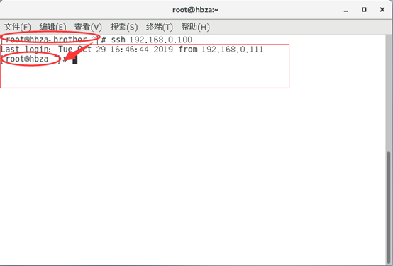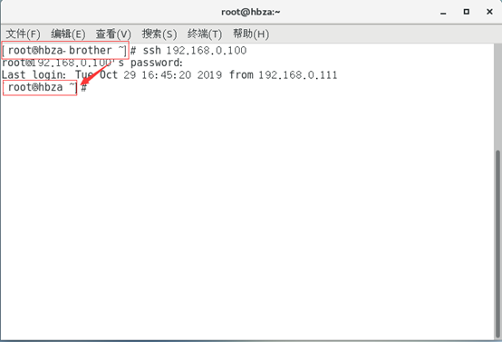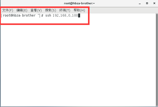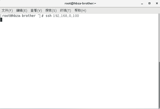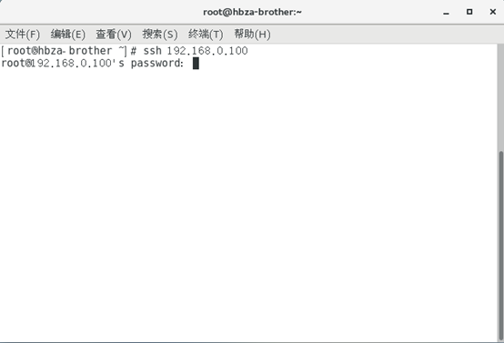 在hbza-brother上打开终端,直接执行命令:ssh 192.168.0.100