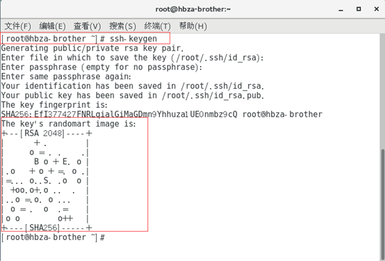 第一步:在本地主机hbza-brother上生成“密钥对”,命令:ssh-keygen