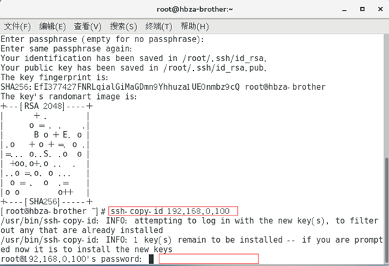 第二步:将生成的密钥传送到远程主机hbza中,命令:ssh-copy-id 192.168.0.100