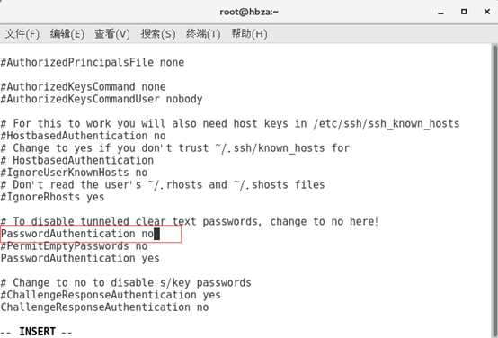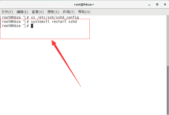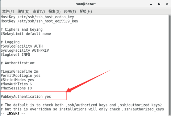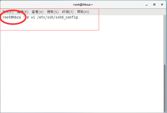 第三步:在远程主机hbza中修改sshd配置文件,命令:vi /etc/ssh/sshd_config