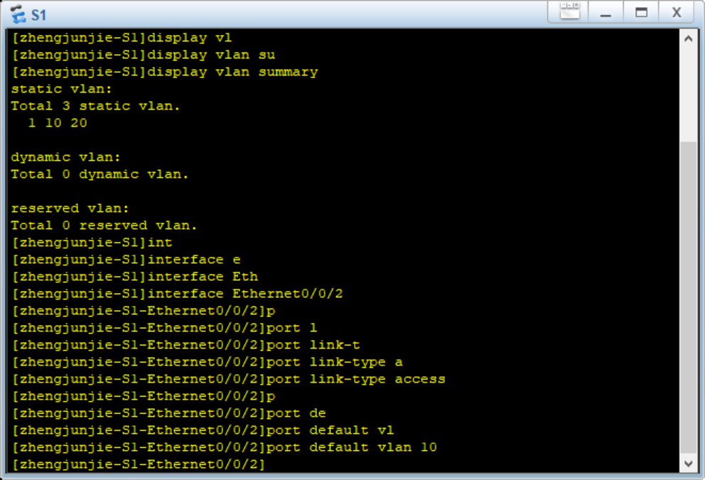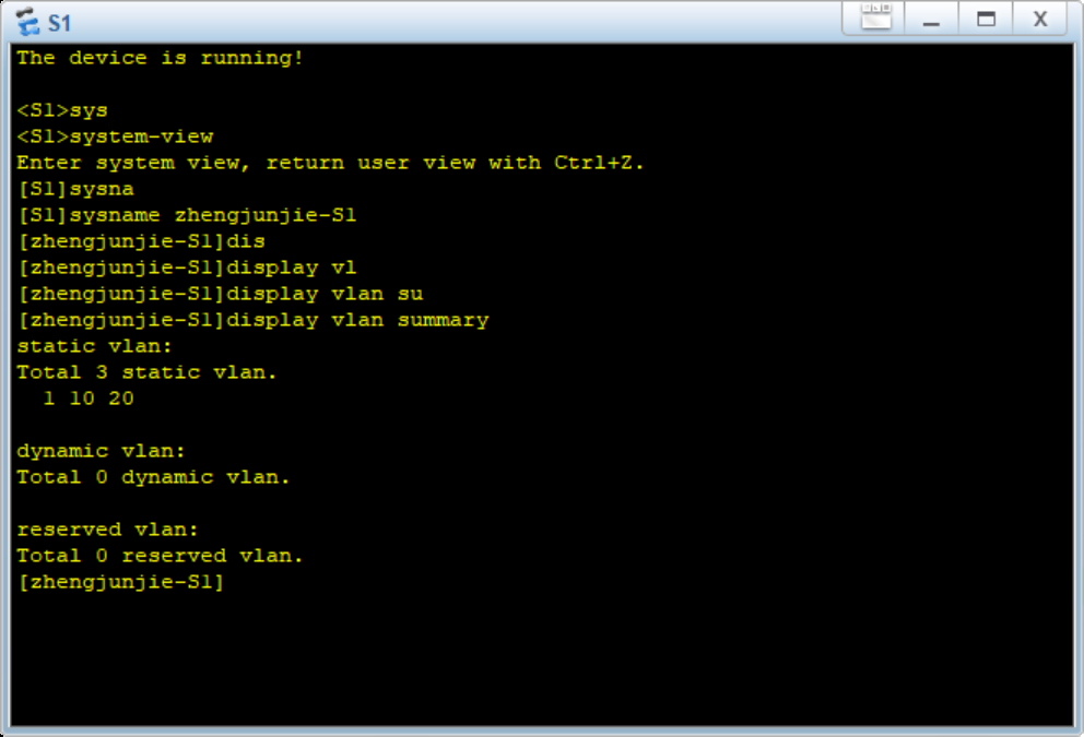 (4) 使用display vlan summary来查看配置好的vlan简要信息,(这里以zhengjunjie-S1为例,实际上三个交换机都需要检查一下vlan是否配置好)