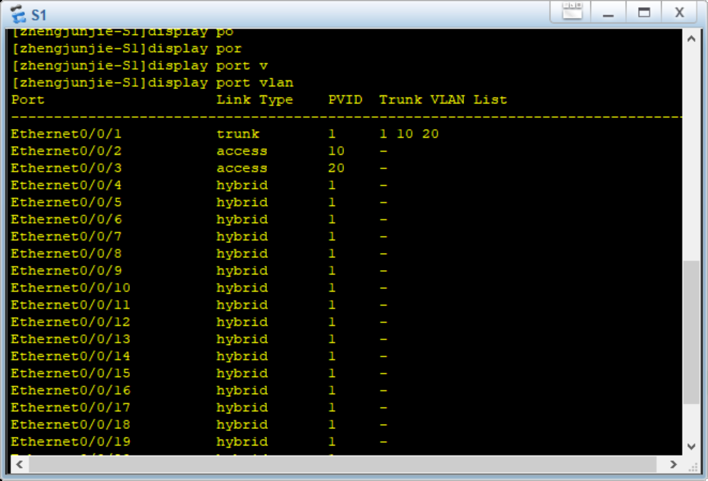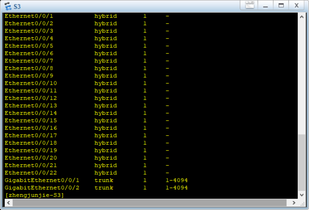 (8) 使用display port vlan 命令来查看Trunk的配置情况,这里以zhengjunjie-S3为例