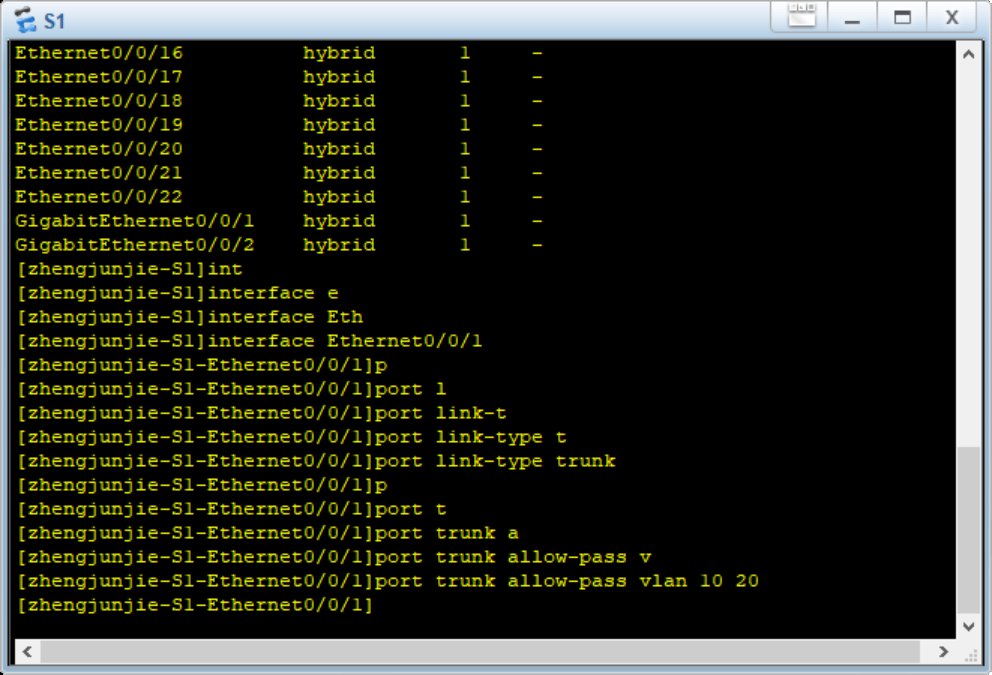7.1在zhengjunjie-S1上配置E 0/0/1为Trunk接口,允许VLAN10和VLAN20通过。