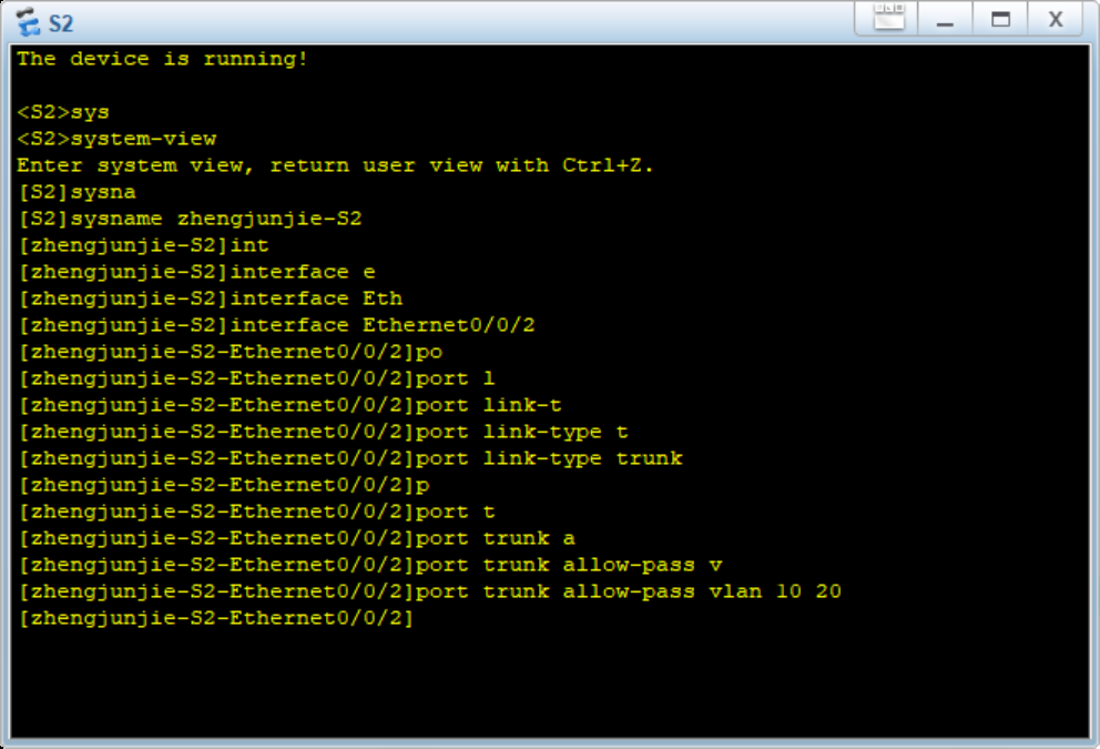 7.2在zhengjunjie-S2上配置E 0/0/2为Trunk接口,允许VLAN10和VLAN20通过。