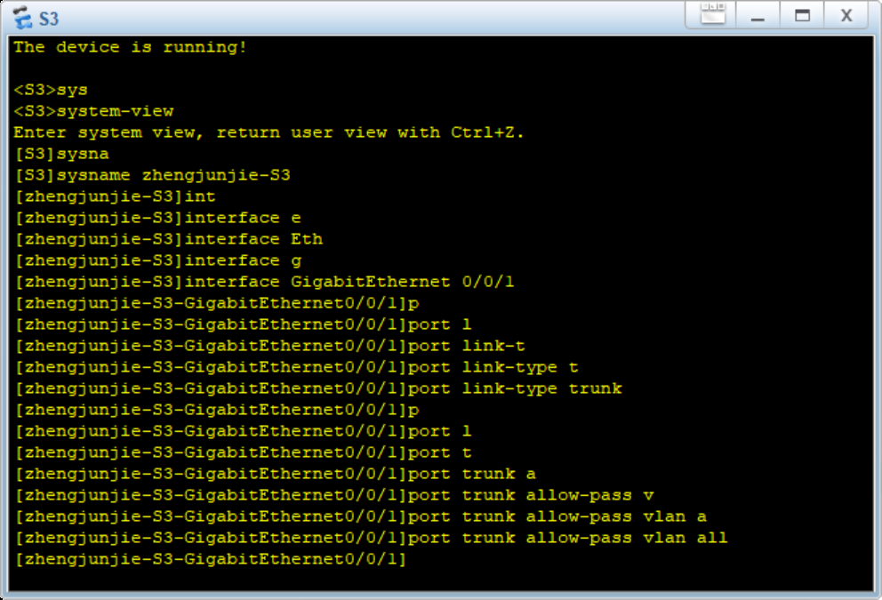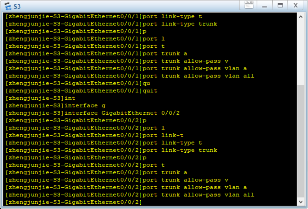 7.3在zhengjunjie-S3上配置GE 0/0/1和GE 0/0/2为Trunk接口,允许所有VLAN通过。