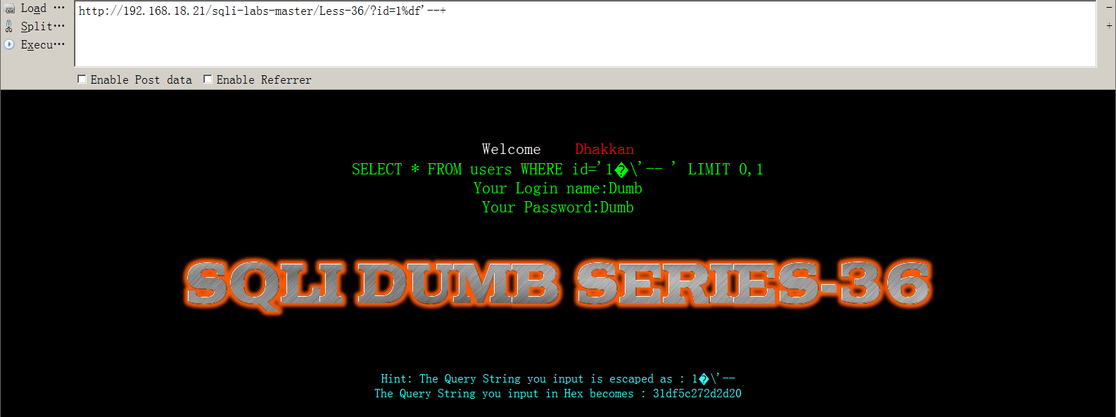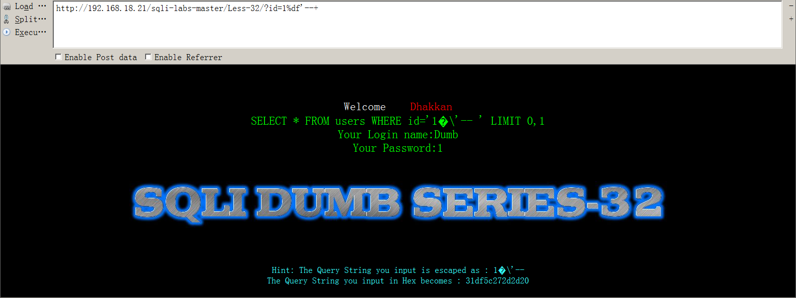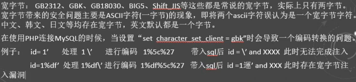 简单来说就是,再mysql中id=1在处理时,会转换为1\',\'并不影响执行,对于id值进行处理时,是两位两位进行处理的,也就是说%5c原来代表\,但在前面加上%df后,%df%5c就被转义为了一个汉字。。。