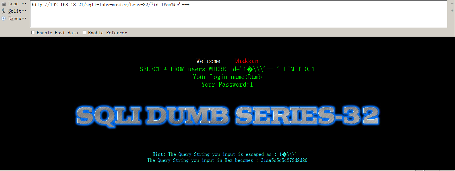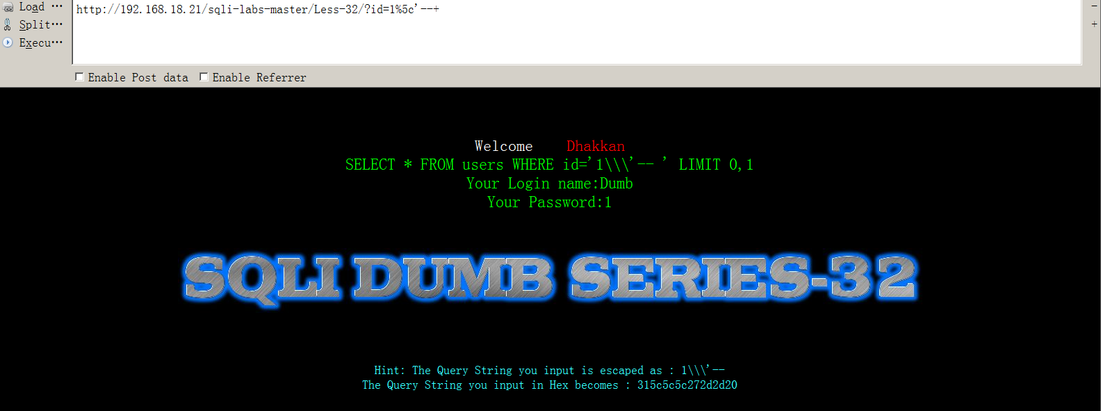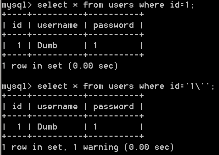 方法二:我们知道%5c会被转义为\,输入id=1%5c'--+返回正确,通过返回信息我们看出它对%5c进行了处理,在%5c后又加了一个%5c。。。