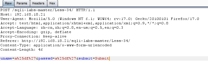 我们使用burpsuite进行抓包,通过抓到的包我们发现它对%在post传输中会变成%25,导致无法使用%df进行宽字节注入。。。