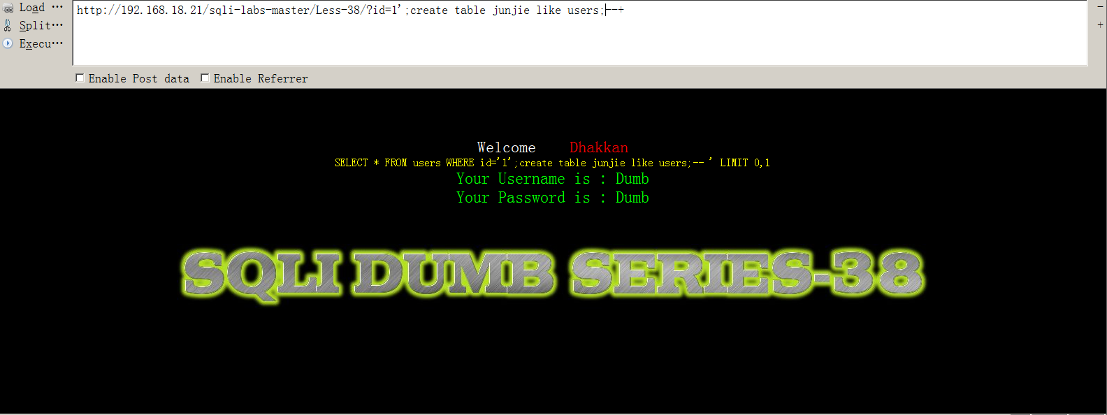 首先输入id=1返回成功,我们通过返回信息可以看到id=‘1’,所以我们输入id=1'--+返回成功,我们使用堆叠注入,创建名为junjie的表,返回成功。。。