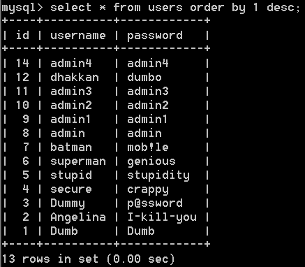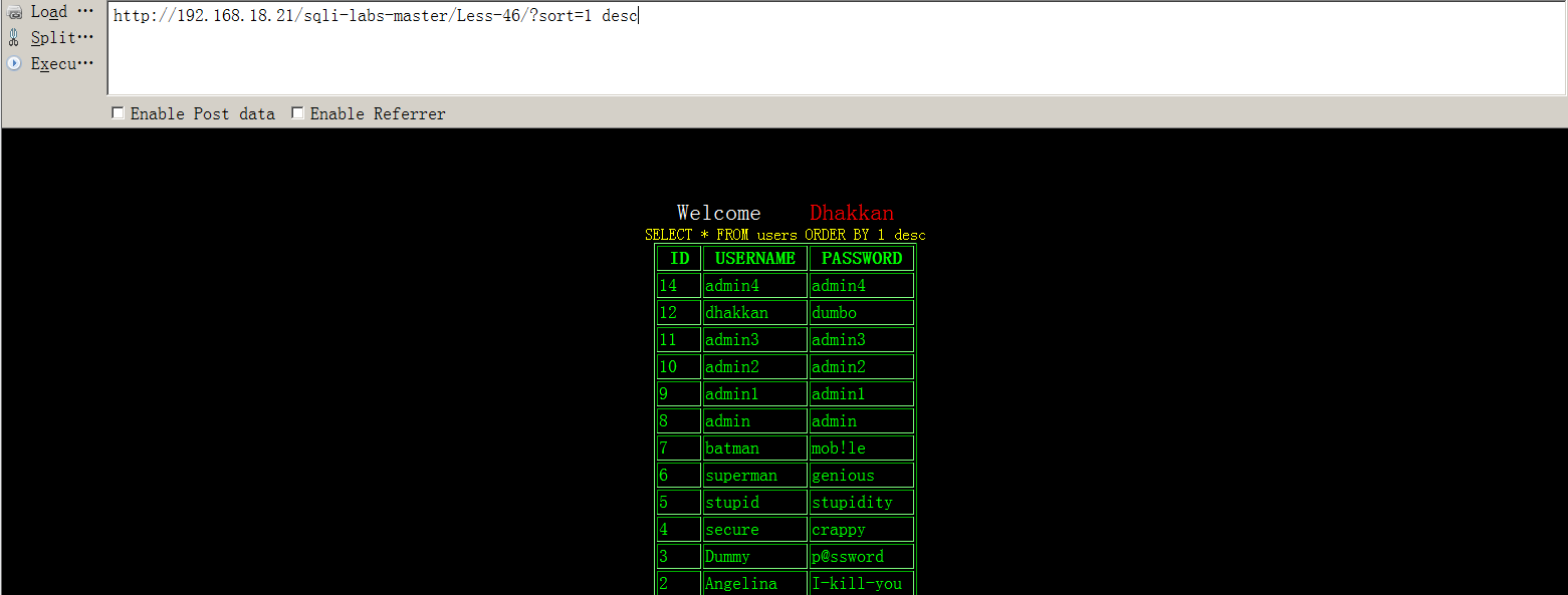 再输入?sort=2查看返回信息,发现order by后面变成2,数据按照第2列进行排列,我们试一下在后面加上desc,发现数据成功降序排列,说明此处存在注入点。。。