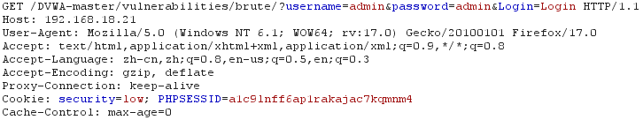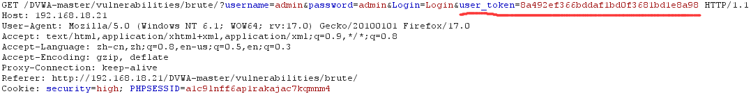 相比Medium级别的代码,High级别的代码增加了Token,可以抵御CSRF攻击,同时也增加了爆破的难度,通过抓包,可以看到,登录验证时提交了四个参数:username、password、Login以及user_token。