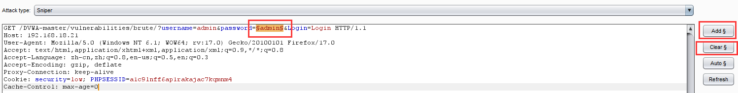 将抓到的包选中右键选择发送到Intruder模块,因为要对password参数进行爆破,所以我们首先清除所有$符,然后在password两边加上$符。