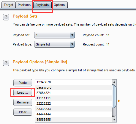 点击Payloads,载入字典(自己随便建的,瞎写一些再写个真密码模拟即可),点击左上角Intruder中的Start attack进行爆破。