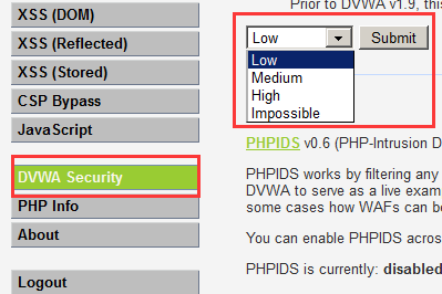 2.在DVWA Security中可切换等级: