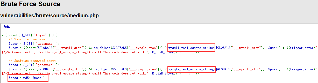 除此之外,$pass做了MD5校验,杜绝了通过参数password进行sql注入的可能性,但依然没有加入有效的防爆破机制,所以依然可以使用Burpsuite进行爆破,与Low级别的爆破方法一样。