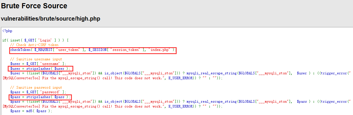 每次服务器返回的登陆页面中都会包含一个随机的user_token的值,用户每次登录时都要将user_token一起提交。服务器收到请求后,会优先做token的检查,再进行sql查询。