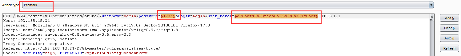 使用burpsuite进行代理,打开burpsuite,利用burpsuite进行抓包,将抓到的包选中右键选择发送到Intruder模块,因为要对password和user_token两个参数进行爆破,所以我们首先清除所有$符,然后再password和user_token两边加上$符,攻击类型选择pitchfork(草叉模式):它可以使用多组Payload集合,在每一个不同的Payload标志位置上(最多20个),遍历所有的Payload。举例来说,如果有两个Payload标志位置,第一个Payload值为A和B,第二个Payload值为C和D,则发起攻击时,将共发起两次攻击,第一次使用的Payload分别为A和C,第二次使用的Payload分别为B和D。