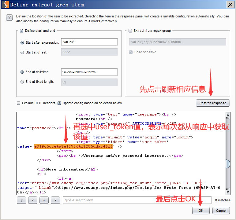 然后下拉找到Grep-Extract,意思是用于提取响应消息中的有用信息,点击Add,如下图进行设置,并将user_token的值复制,最后将Redirections设置为Always。