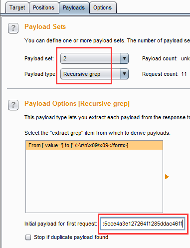 点击payloads,第一个参数设置与low级别设置相同,第二个参数选择Recursive grep(用服务器每次返回的数据来替换payload中的变量值),然后将options中的token作为第一次请求的初始值。