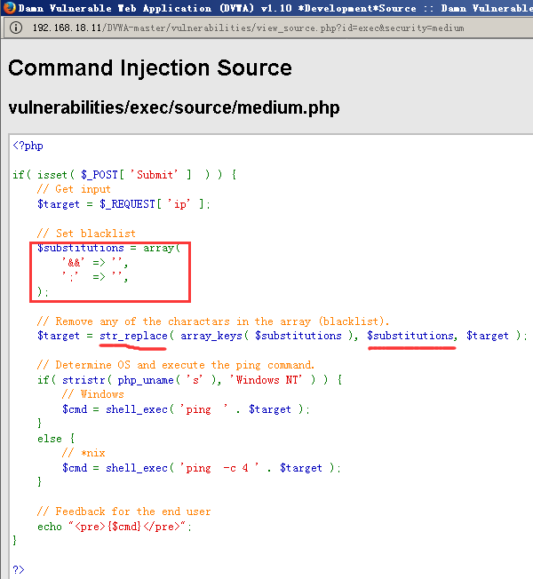 相比Low级别的代码,服务器端对ip参数做了一定过滤,即把”&&” 、”;”删除,本质上采用的是黑名单机制,因此依旧存在安全问题。