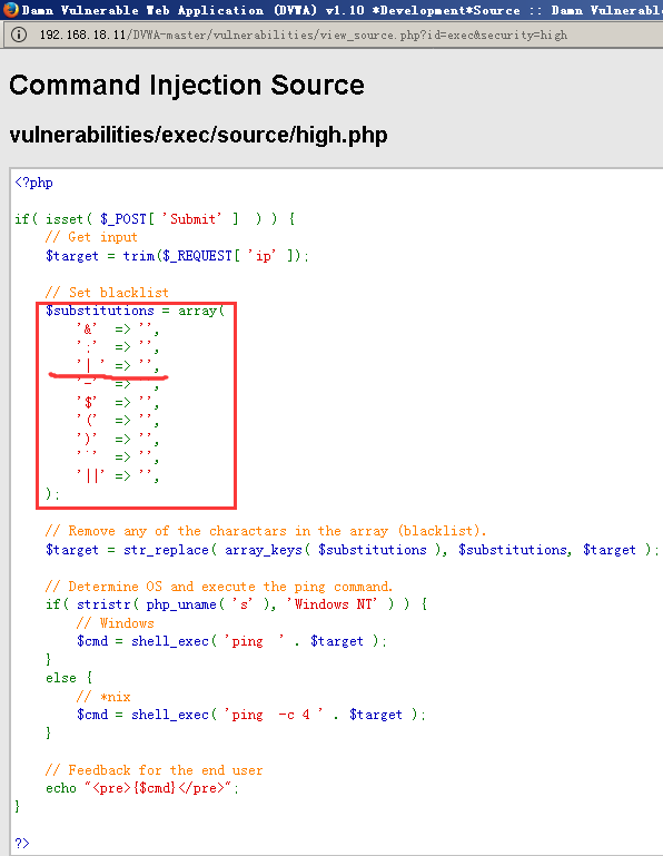 相比Medium级别的代码,High级别的代码进一步完善了黑名单,但由于黑名单机制的局限性,我们依然可以绕过。