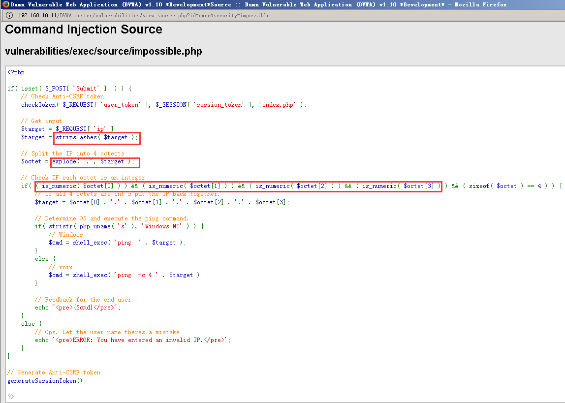 可以看到,Impossible级别的代码加入了Anti-CSRF token,同时对参数ip进行了严格的限制,只有诸如“数字.数字.数字.数字”的输入才会被接收执行,因此不存在命令注入漏洞。