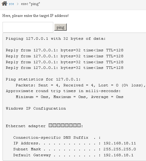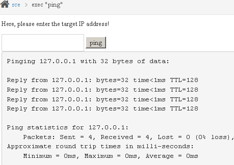 比如我们常见的路由器、防火墙、入侵检测等设备的web管理界面上,一般会给用户提供一个ping操作的web界面,用户从web界面输入目标IP,提交后,后台会对该IP地址进行一次ping测试,并返回测试结果。
