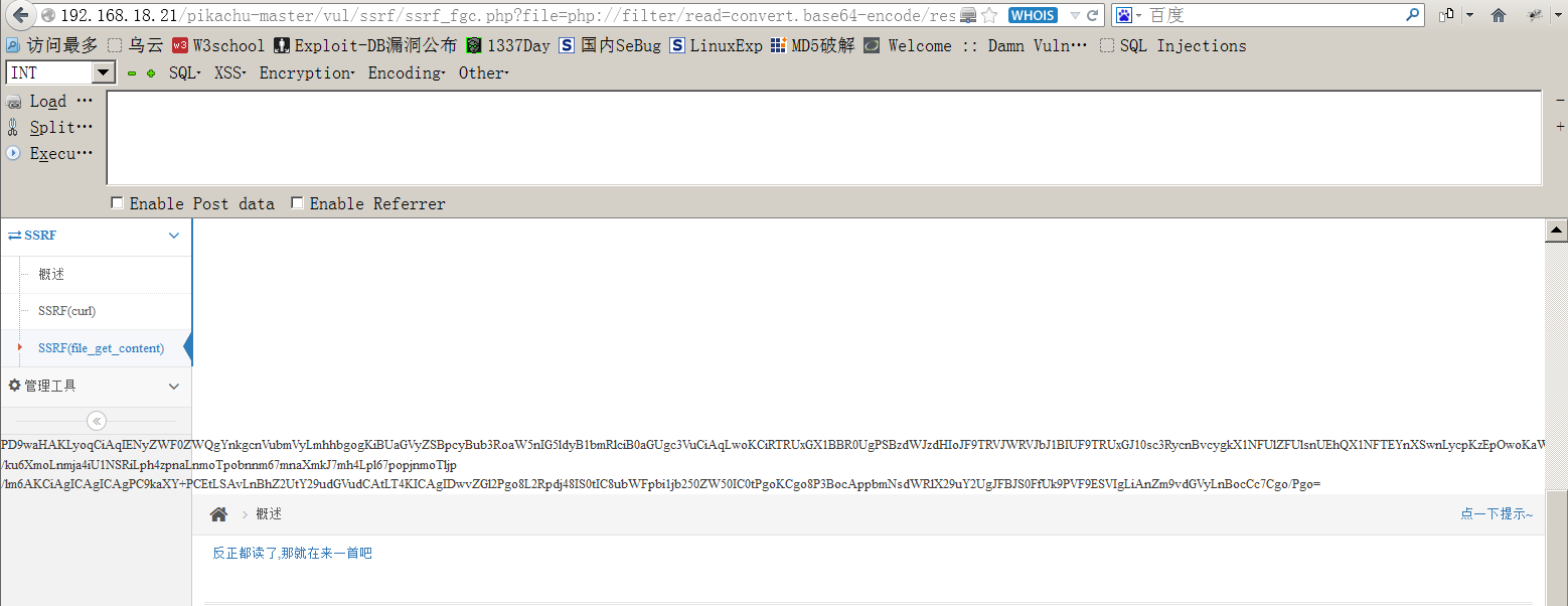 说明可以访问其他主机地址,但不能测试其他主机端口号,也可以通过64进制编码获得php文件内容。
