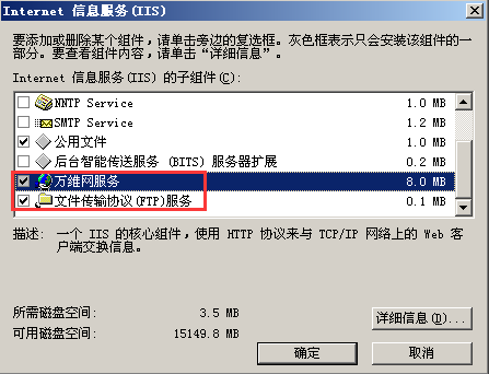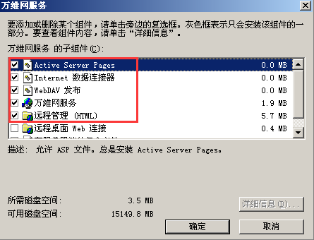 选中Active Server Pages、Internet 数据连接器、WebDAV发布、万维网服务和远程管理(HTML),点确定,点下一步