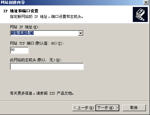 下一步,网站IP地址如果自己总调可以默认未分配,端口的话如果自己有多个网站可以用不同的端口号,防止冲突,如果自己有多个网站都要用同一个端口号,可以用主机头来实现,主机头其实就是域名。