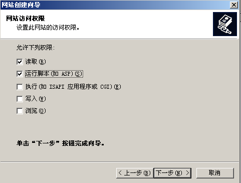 下一步,因为我们的程序使用asp写的,所以我们需要勾选执行asp脚本,否则运行不了,其他的权限都是可选项,给多了可能会造成安全问题。