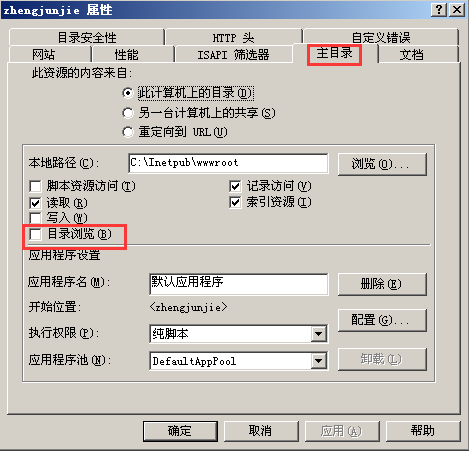 3.如果没有index.asp文件,在主目录里选上目录浏览的话,页面会展示所有的目录,这样会带来很大的安全问题,所以默认不给目录浏览权限。