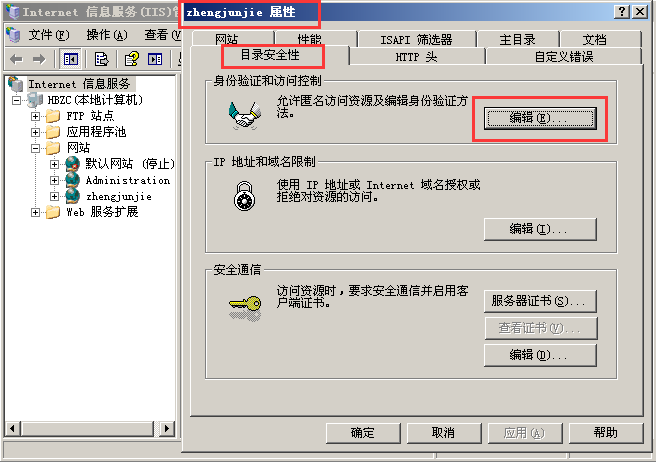 可以在网站属性---目录安全性---编辑身份验证和访问控制中查看。