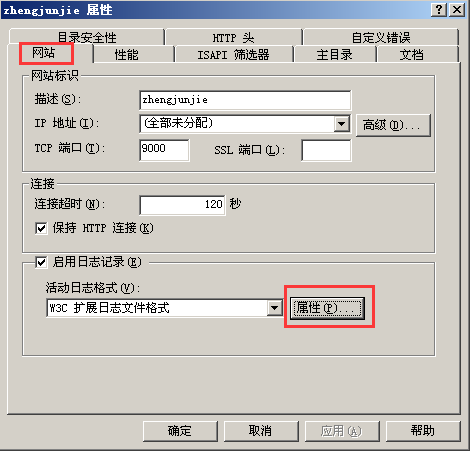 打开IIS,右击所要查看日志的网站,点击属性,点击网站中的日志属性。