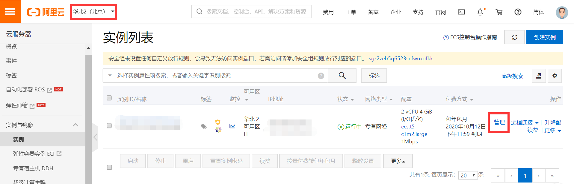 设置安全组,点击管理。