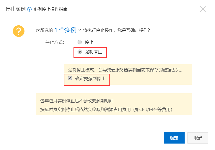 点击右上角停止,选择强制停止。(基于我买了服务器什么都没做的情况下,可能会造成数据丢失)