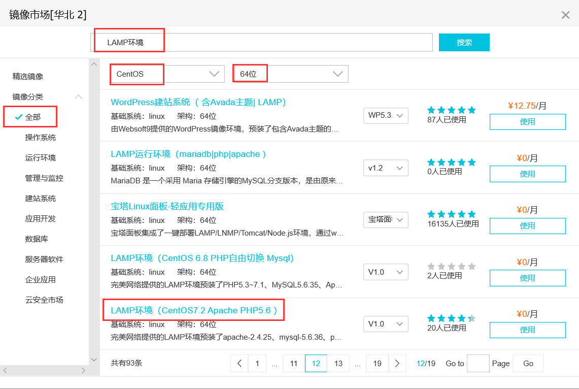 搜索LAMP环境,筛选基于Linux,64位,因为我当时领取服务器选择的是centos 7.2,所以找到下图这个,点击使用。(切记是大写的OS)