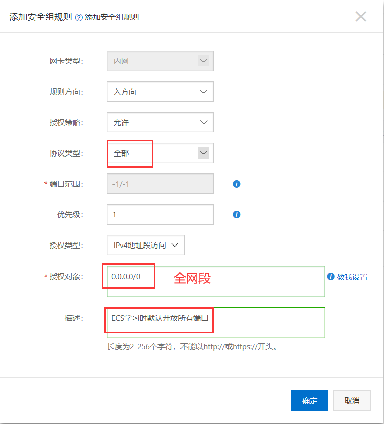 如下图红框修改,点击确定(设置的是全端口开放,允许全网段访问)