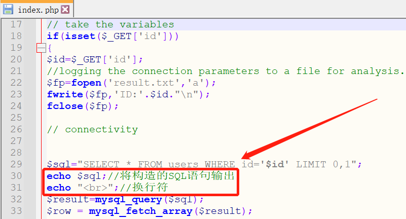 为便于学习构造SQL语句的方式,需在每个less下的index.php文件中添加输出SQL语句的代码: