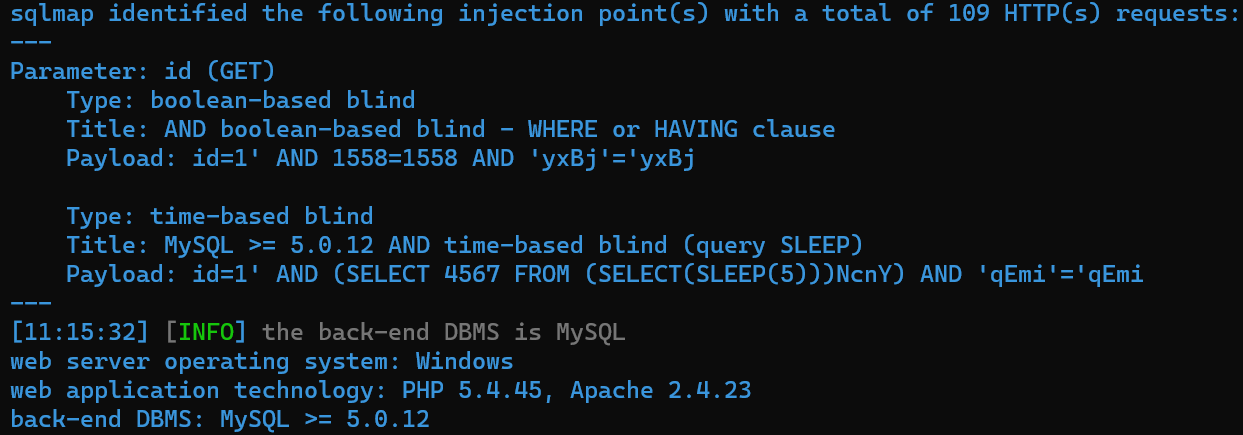 使用sqlmap工具,跑出存在布尔盲注和时间盲注,还有数据库版本等信息